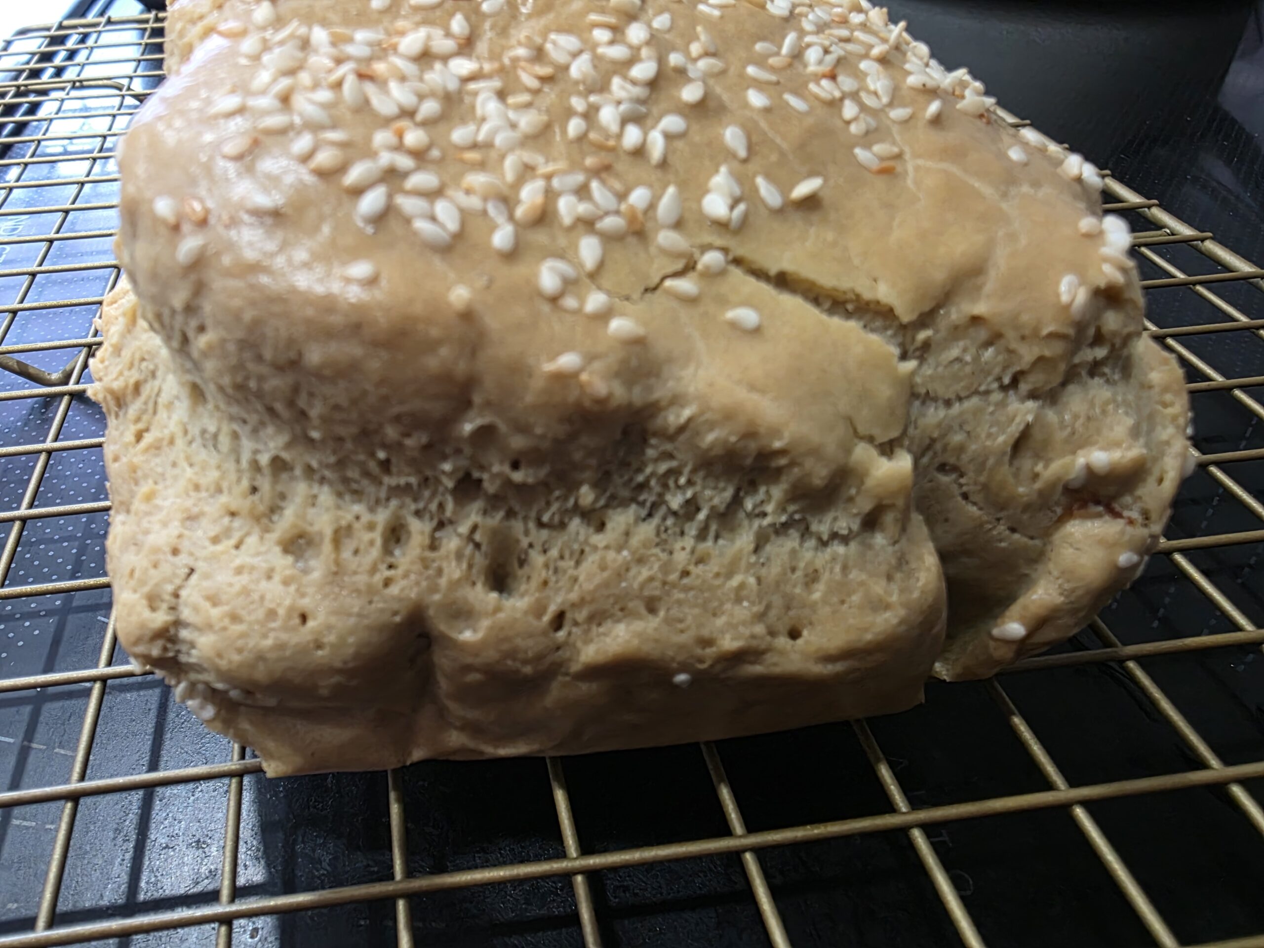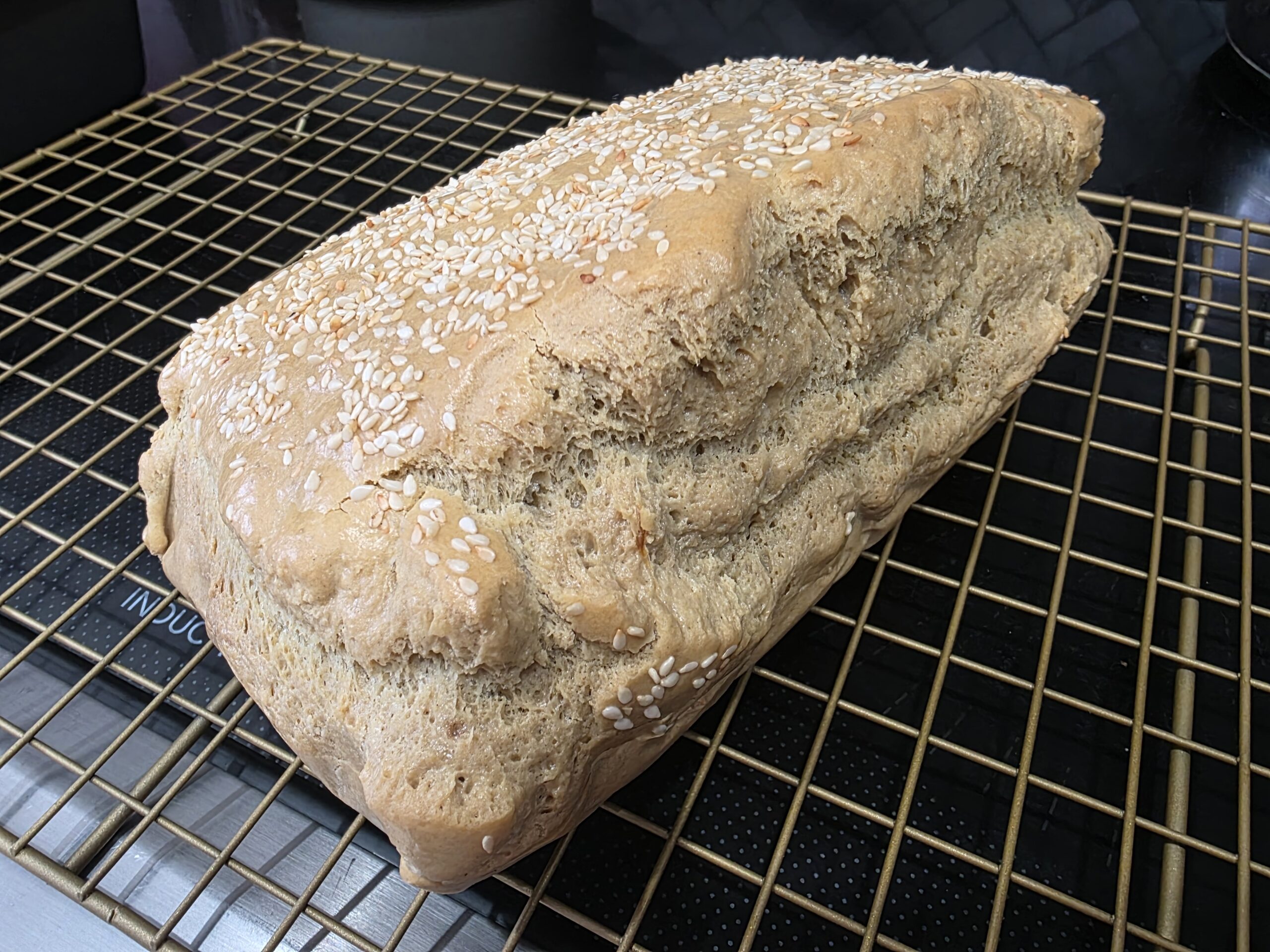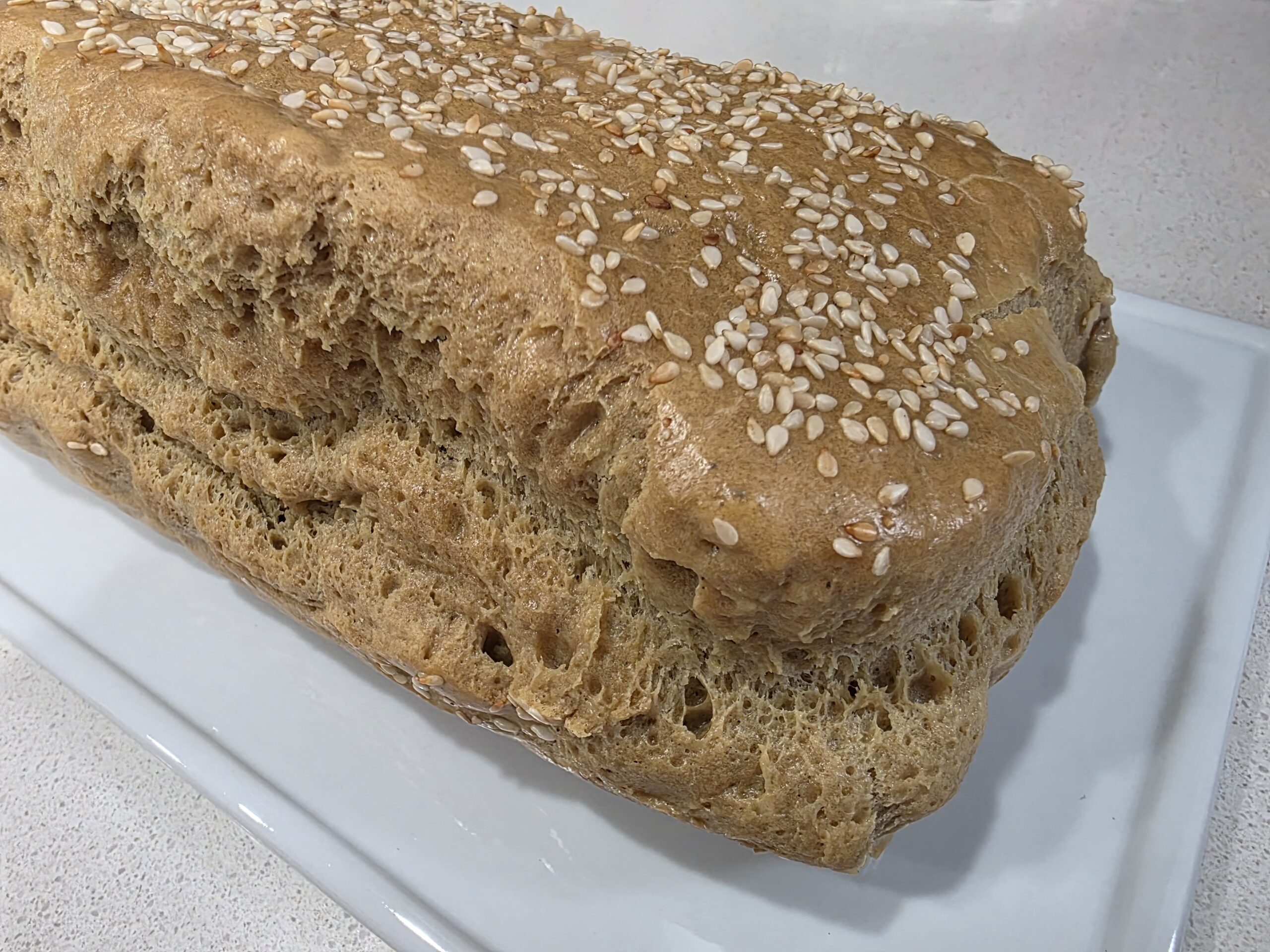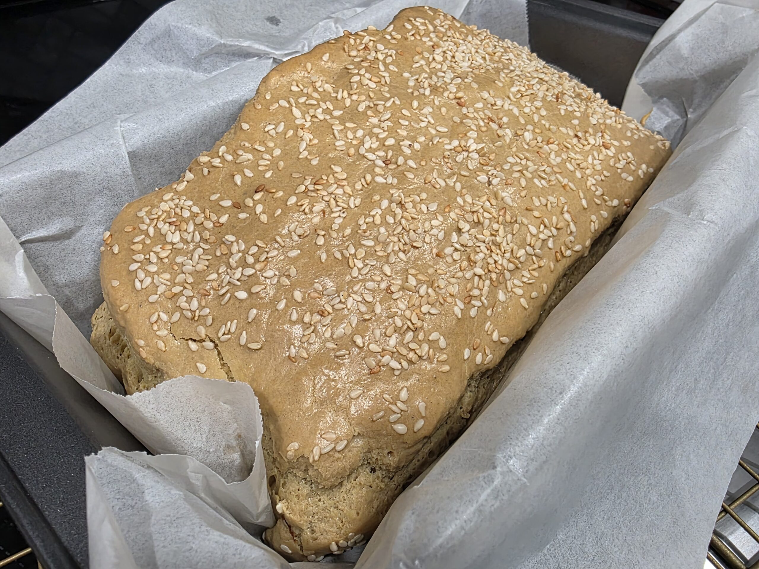 This unique loaf is flourless, gluten-free and has a distinct sesame seed flavour. Definately something to try at least once. Simple ingredients cause this loaf of bread to give new meaning to the words: